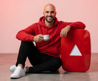 Hyper-realistic full-body portrait of the person from the uploaded image, sitting casually on a minimalist studio floor. Beside them stands a giant vertical YouTube play button icon, oversized and placed firmly on the ground, slightly tilted for a stylish modern aesthetic. The icon is about arm-height so the subject can rest one arm on it confidently. In the other hand, the subject holds a coffee cup like a content creator during a break. Expression confident and relaxed, looking slightly toward the camera. Outfit: red streetwear hoodie, black trousers, clean white sneakers.Camera simulation: full-frame DSLR, 85mm portrait lens, shallow depth of field, extremely sharp focus on the face.Background: minimal pastel red YouTube-style studio background with soft cinematic lighting wrapping naturally around the face and shoulders, subtle shadows for depth.Ultra-detailed textures on skin, hair, hoodie fabric, shoes, and the glossy YouTube play button surface.