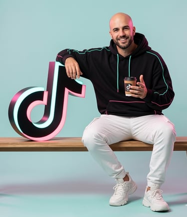 A hyper-realistic full-body portrait of the uploaded image sitting casually beside a tall, glowing TikTok logo, slightly tilted for motion and flair. One arm rests on the logo, the other hand holds a cup mid-gesture. Captured in DSLR-style realism, crisp textures, and shallow depth of field. Background: soft pastel teal studio with subtle pink highlights, evoking a neon bounce light effect. Outfit: black oversized hoodie with neon trim, white cargo pants, and chunky sneakers. Style: energetic, youthful, ultra-detailed -like a street-style campaign shot, not CGI