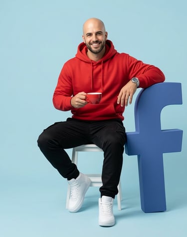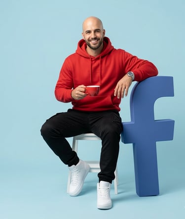 Hyper-realistic full-body portrait of uploaded image. Their pose is "sitting" Beside them stands a vertical oversized Facebook icon", placed firmly on the ground, slightly tilted for a stylish aesthetic. The object is approximately at arm-height, allowing them to casually lean one arm on it for support. In their other hand, they hold a "cup". Use a full-frame DSLR camera simulation, crisp image with shallow depth of field. Background: Minimal pastel blue studio with soft cinematic lighting: that wraps naturally around the face and shoulders, casting delicate shadows and depth. Ultra-detailed textures on clothing, skin, hair, and object surfaces. The subject wears a red streetwear hoodie, black trousers, and white shoes Rendering style: Clean, minimal, modern, and visually striking- must look like a professional fashion photo, not CGI