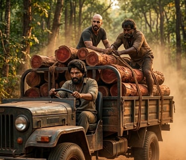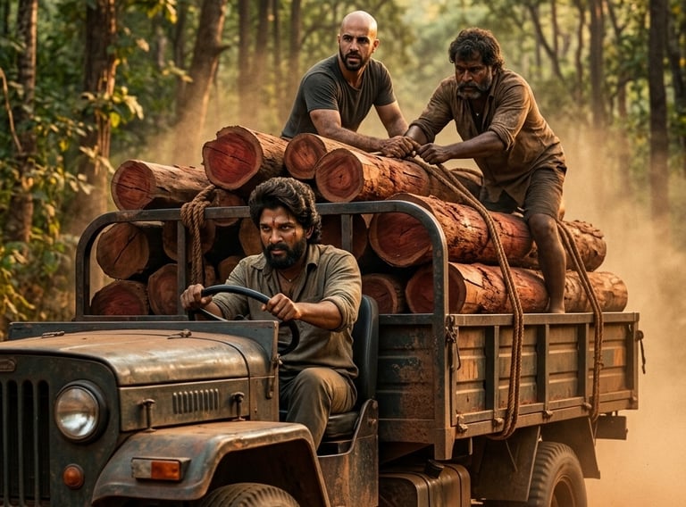 Prompt: A dusty, rural forest road action scene. Allu Arjun (Pushpa Raj) is driving a heavily modified rustic truck loaded with red sandalwood logs, a focused grimace on his face. [User.Face] stands on the back of the moving truck bed, helping another man quickly secure logs, his face showing effort and caution. Detailed forest textures and dynamic dust.