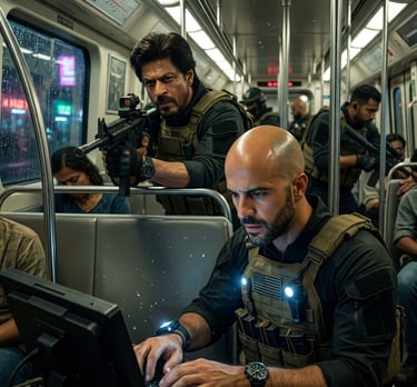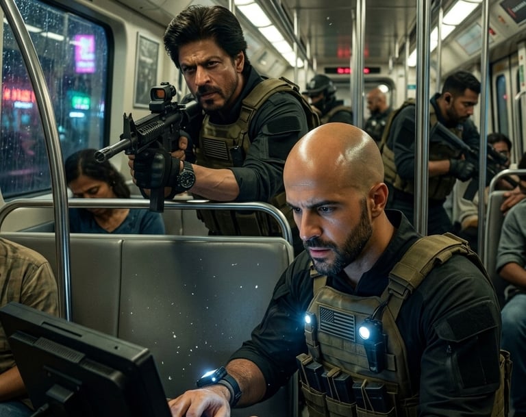 Prompt: A cinematic indoor close-up tactical scene inside a crowded Mumbai Metro car. Shah Rukh Khan (in tactical gear, face a stern commando look) aims a weapon. In the foreground, [User.Face] is in tactical gear, intensely focused on a hacking panel, his face professionally concentrated, small tactical lights on. Background team in action. Realistic indoor textures.